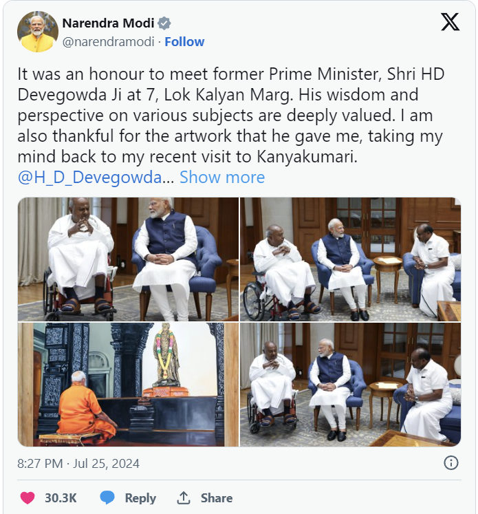 ‘पूर्व प्रधानमंत्री श्री एच.डी. देवेगौड़ा जी से 7, लोक कल्याण मार्ग पर भेंट करना सम्मान की बात थी। विभिन्न विषयों पर उनकी बुद्धिमत्ता और नजरिए को बहुत महत्व दिया जाता है। मैं उस कलाकृति के लिए भी आभारी हूं जो उन्होंने मुझे दी जिससे मुझे कन्याकुमारी की अपनी हालिया यात्रा का स्मरण हो गया। @H_D_Devegowda @hd_kumaraswamy’