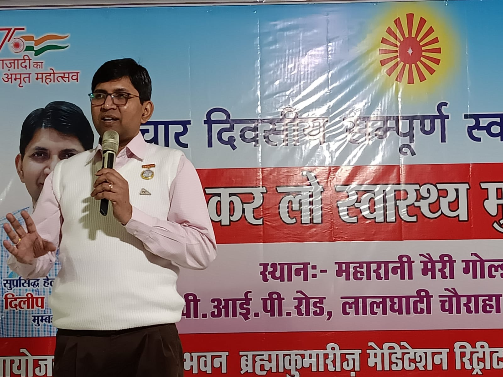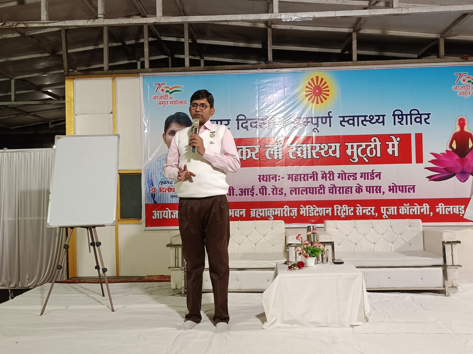 डॉ. नलगे प्रजापिता ब्रह्माकुमारी ईश्वरीय विश्व विद्यालय द्वारा मेरी गोल्ड गार्डन, लालघाटीमें आयोजित कर लो स्वास्थ्य मुट्ठी में के तीसरे दिन “सकारात्मक विचार और स्वास्थ्य” विषय पर बोल रहे थे। उन्होंने तनाव को खत्म करने का सबसे बढिय़ा इलाज राजयोग मेडिटेशन को बतलाते हुए कहा कि इससे आत्मा को पूरा आराम मिलता है। इसलिए तनाव से बचने के लिए हर परिस्थिति में खुश रहना सीखें और मेडिटेशन के माध्यम से अपनी आन्तरिक क्षमता को बढ़ाएँ।